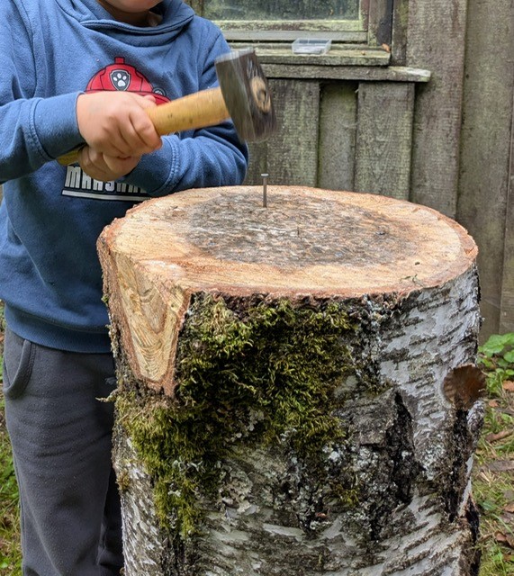 🔨 Mit Hammer und Nagel ging es voller Konzentration an den Holzstamm.