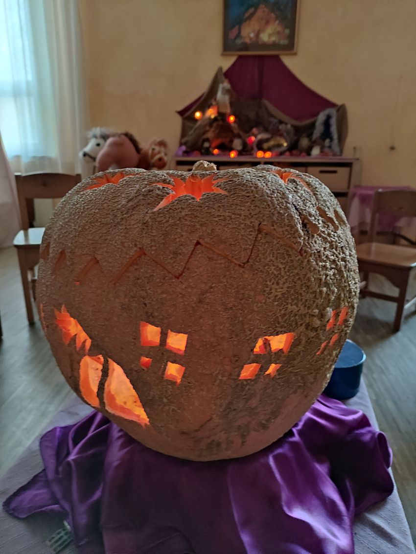 Dafür haben wir in den Wochen vorher im Wald Stöcke gesucht und mit jedem Kind eine Laterne gebastelt. Das Laufen und singen mit den Laternen haben wir jeden morgen in den Fluren von Haus Sonne geübt. Am Morgen des Festes haben die Kinder einen großen Kürbis geschnitzt und es wurden gemeinsam Martinsmännlein gebacken.