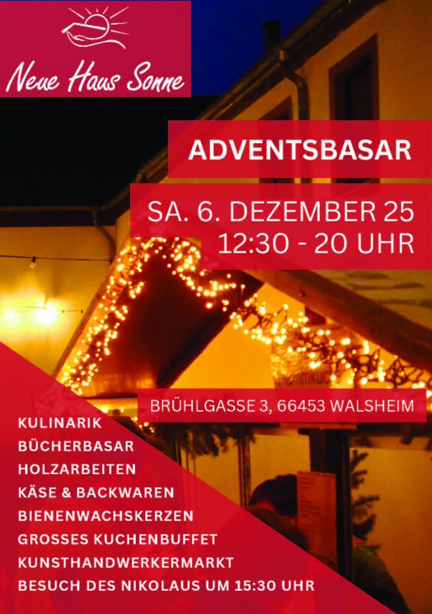 am Samstag den 06.12.2025 (12.30 bis 20.00 Uhr) ist es wieder soweit: unser traditioneller Haus Sonne Adventsbasar / Weihnachtsmarkt findet statt.